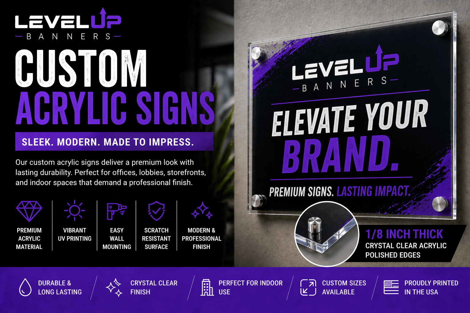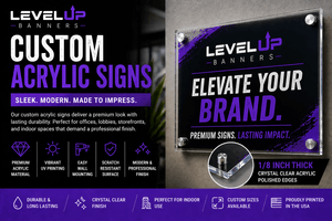 Acrylic signage informs viewers and draws in potential customers. Not all acrylic signs are created equal, though. Level Up Banners offers affordable custom acrylic signs with a wide range of options. These are the perfect custom signs for office spaces, home decor, restaurants, you name it. Read More