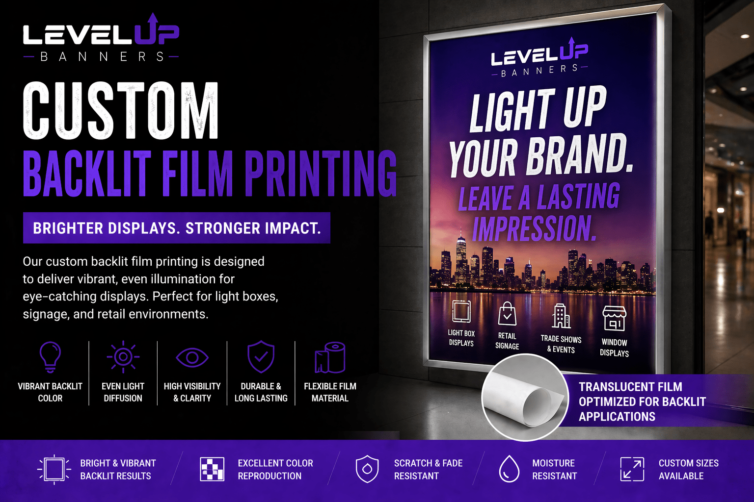 Turn heads day or night with premium 10 mil backlit film prints built for vibrant illumination and unmatched visual impact. Designed for lightboxes, illuminated signage, and retail displays, this high-quality film delivers bold color saturation, crisp detail, and smooth light diffusion that makes your graphics stand out in any environment.