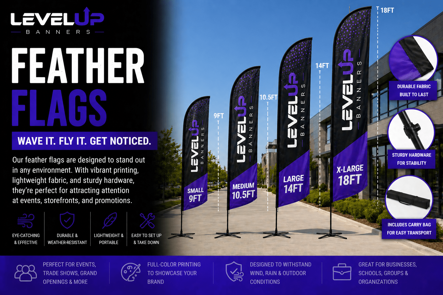 Feather flags deliver eye-catching, high-impact branding with vibrant, full-color prints. Built for durability and movement, they attract attention outdoors and are perfect for events, storefronts, and promotions. Read More