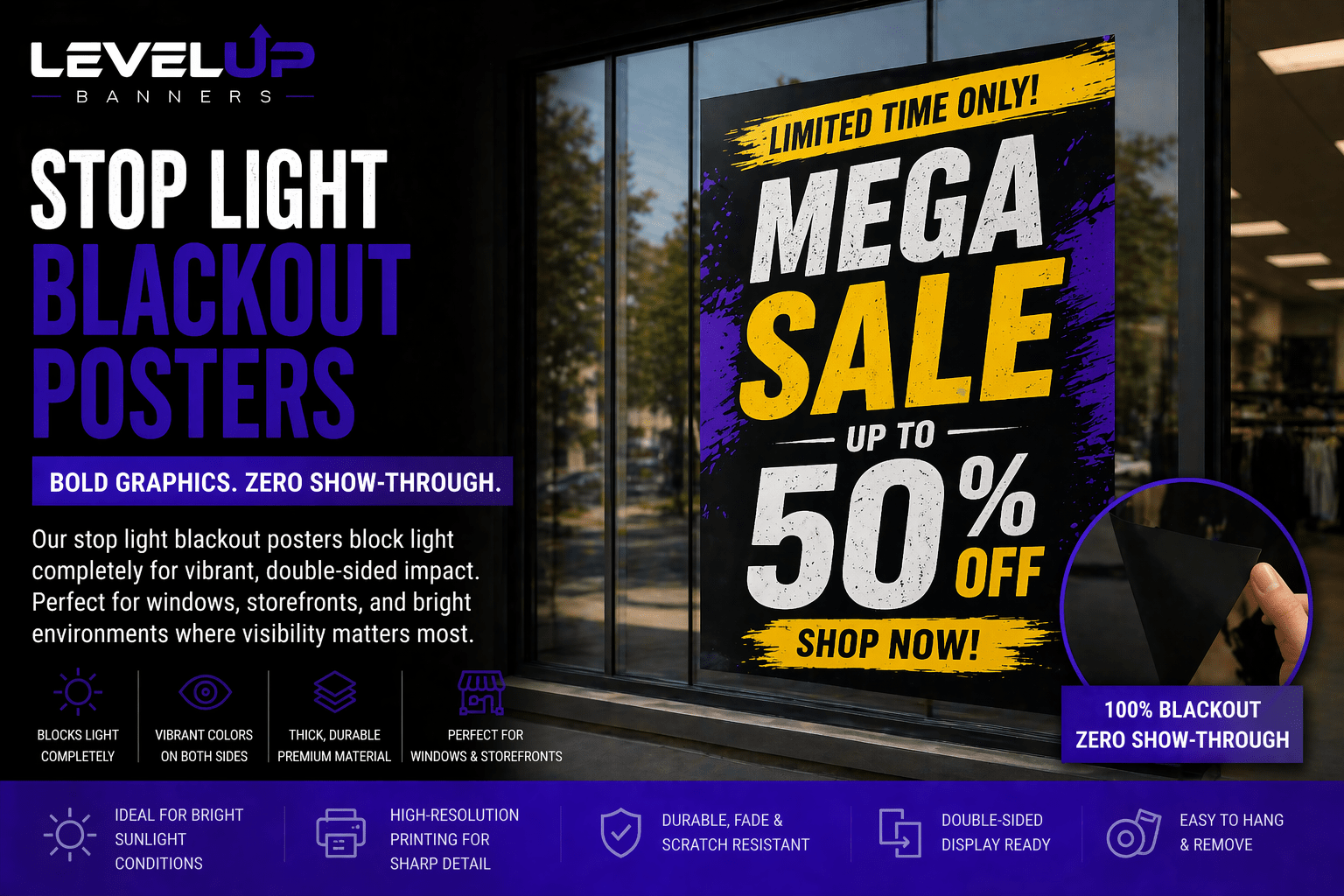 Stop light blackout posters block light completely for bold, high-impact displays. Printed with rich color and sharp detail, they’re perfect for storefronts, windows, and indoor signage without show-through. Read More
