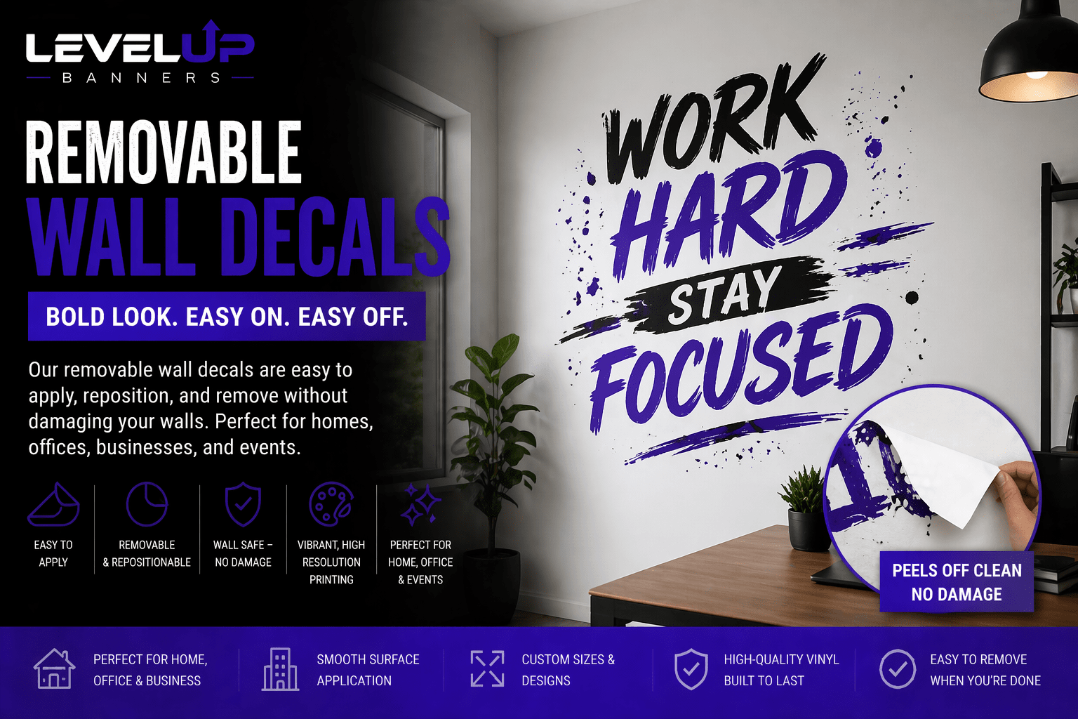 Transform any space in minutes with premium Removable Wall Decals from Level Up Banners. Designed for flexibility and impact, these decals deliver bold, full color graphics that instantly upgrade walls without the commitment of permanent paint or vinyl.